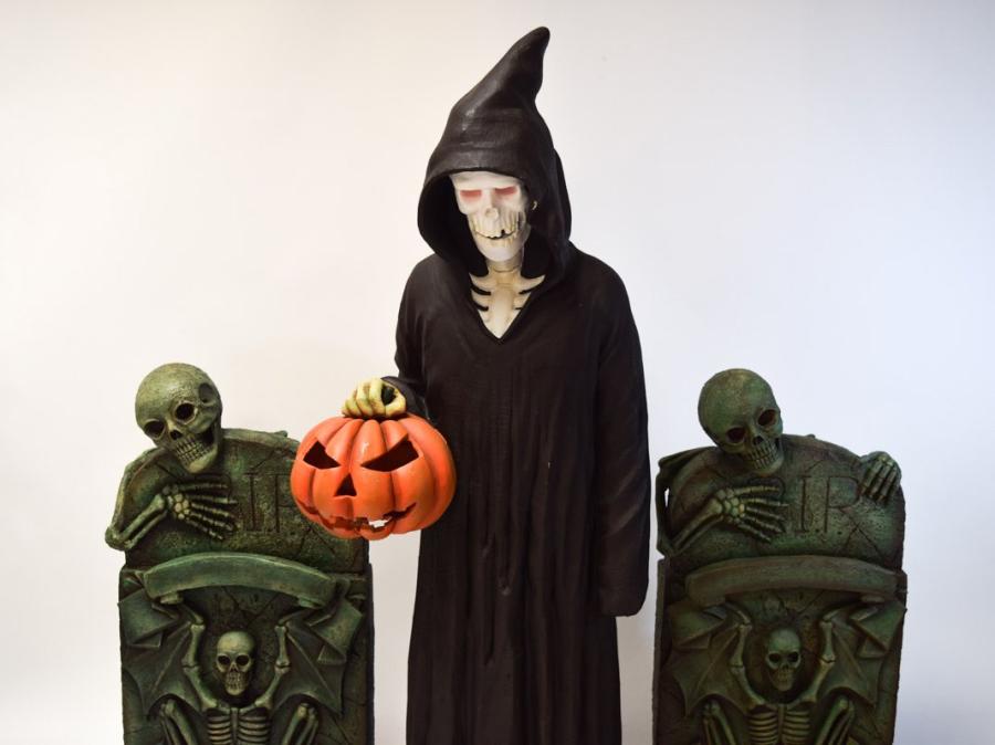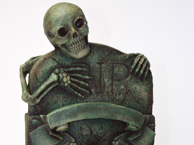 Our grave props are scarily realistic, with a worn finish that give it an eerie look. With skull motifs and a 3D skeleton looming over the top of the grave, it is sure to say that this grave will leave guests with a haunting impression.